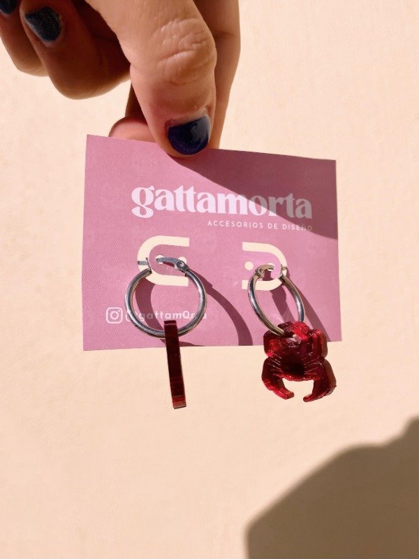 Inspirados en la centolla de la expedición del CONICET, estos aritos de acrílico rojo espejado capturan miradas con su brillo intenso.